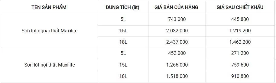 3.3. Bảng giá sơn lót Maxilite sau chiết khấu