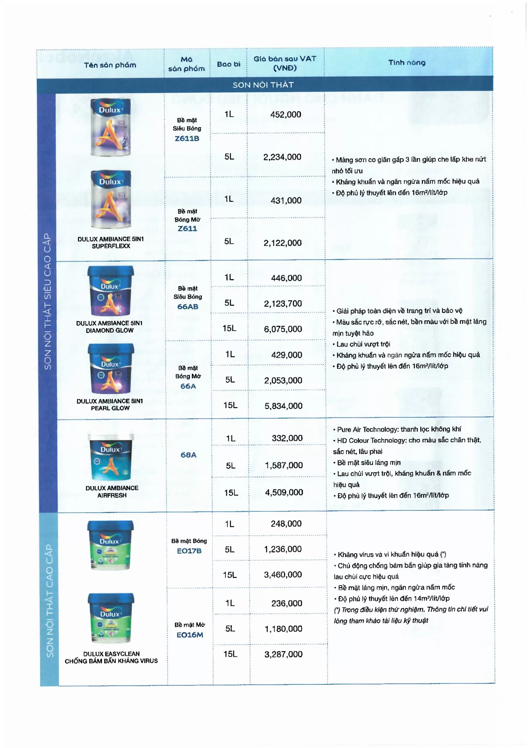 2.1. Bảng giá sơn Dulux hiện nay – Sơn Dulux nội thất